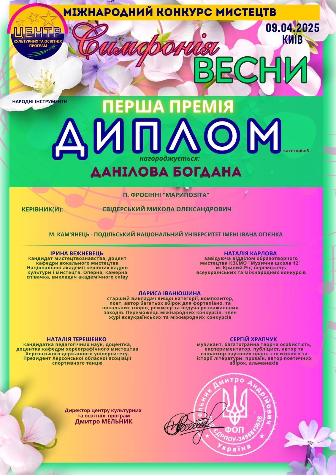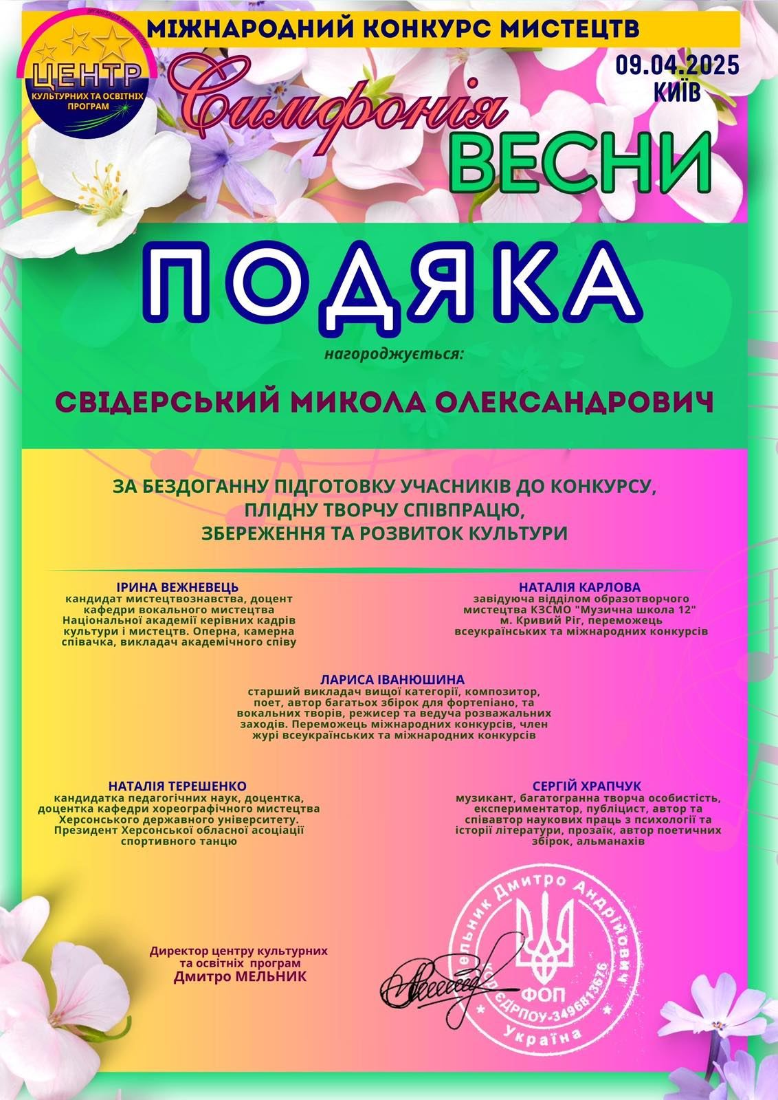 9 квітня 2025 року у місті Київ відбувся Міжнародний конкурс мистецтв “Симфонія весни”.