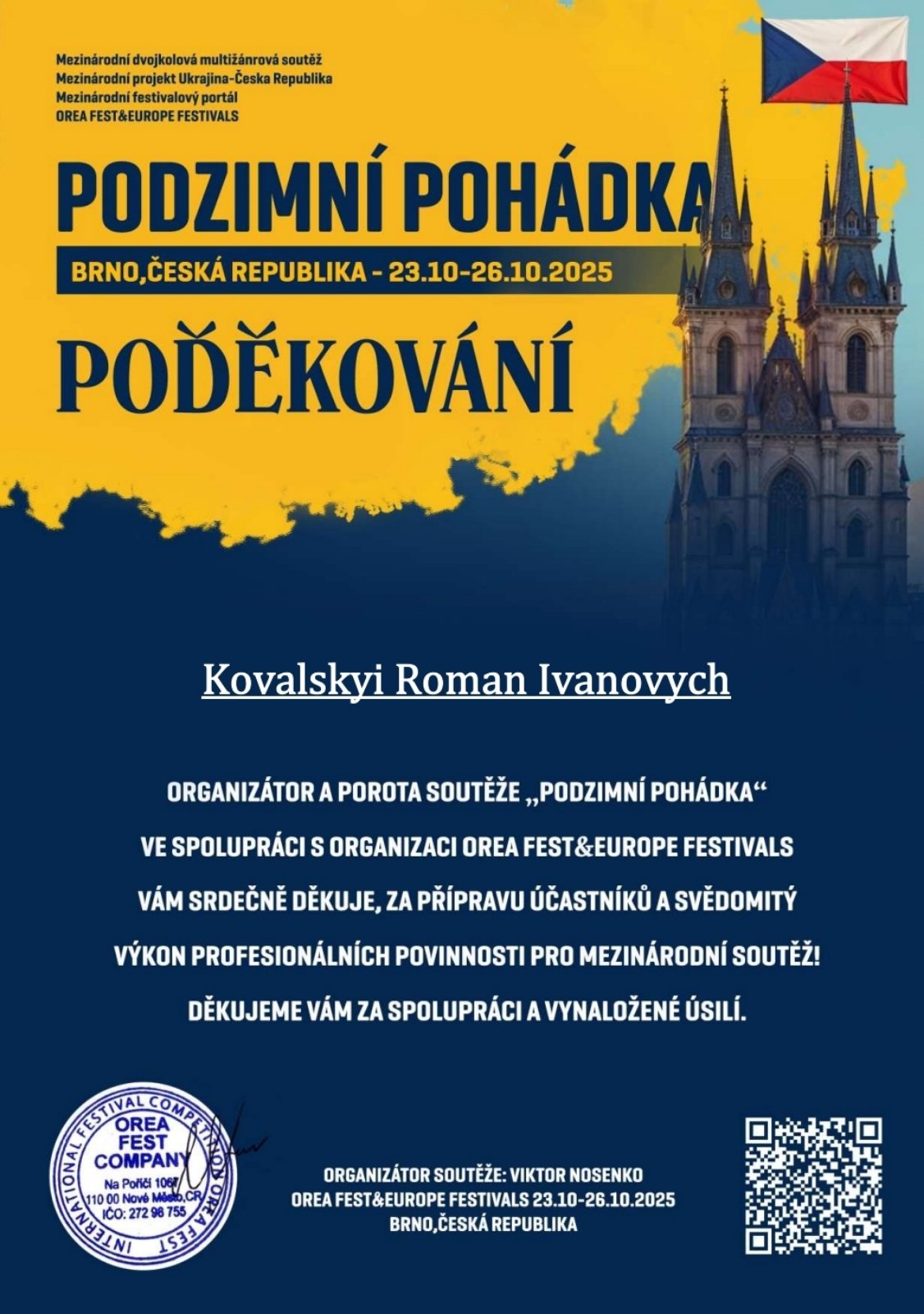 Вітаємо студентку ІІІ курсу Діану ХРУЩ з перемогою (луреат 1 ступеня ) у міжнародному двотуровому конкурсі мистецтв “PODZIMNÍ POHÁDKA”!