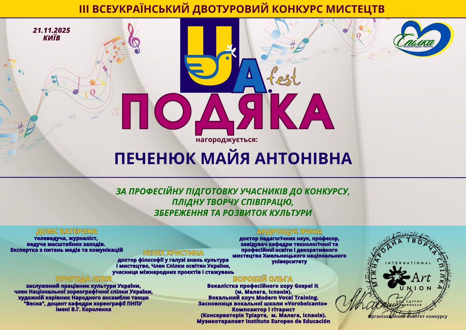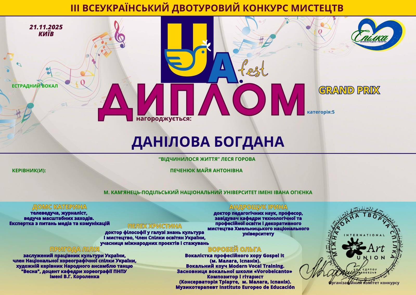 У Києві відбувся ІІІ Всеукраїнський конкурс мистецтв (21.11.2025), на якому студентка предметної спеціальності Середня освіта (Музичне мистецтво) (клас проф. М. Печенюк) Богдана Данілова (IV курс) виборола GRAND PRIX. Богдана виконала твір Л. Горової «Відчинилося життя». Тож вітаємо Богдану і бажаємо їй творчого підйому, вдячної публіки і гучних овацій. Нехай пісні у її виконанні стають джерелом радості і задоволення для слухачів, нехай її виступи супроводжуються посмішками глядачів і букетами квітів, нехай доля дарує щастя, а життя ллється красивою піснею.
