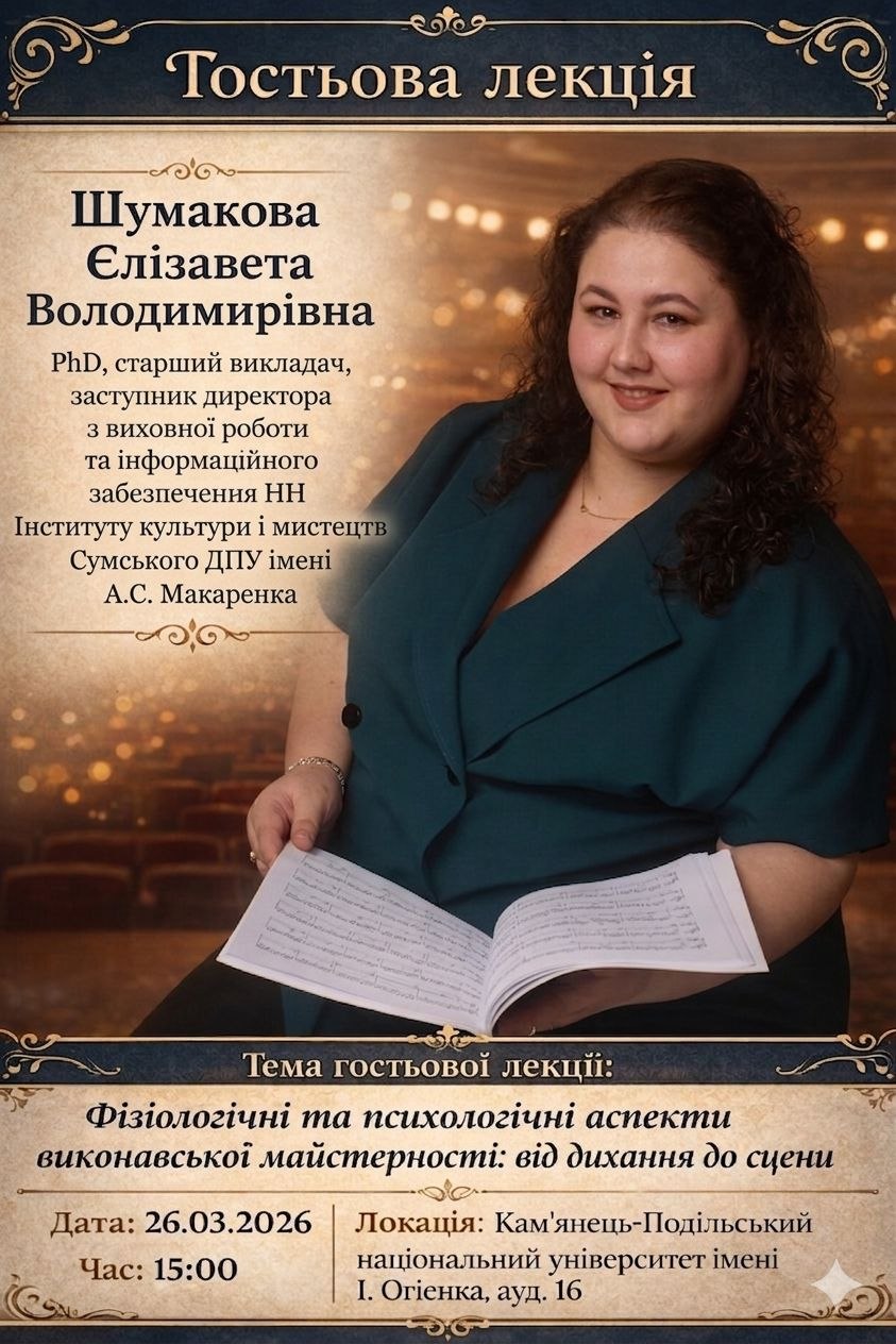 26 березня 2026 року у межах проведення ІХ Всеукраїнського музичного конкурсу “MusicUniFest-2026” відбудеться гостьова лекція “Фізіологічні та психологічні аспекти виконавської майстерності: від дихання до сцени” Шумакової Єлізавети Володимирівни. Запрошуються здобувачі вищої освіти, учасники конкурсу та поціновувачі музичного мистецтва.
