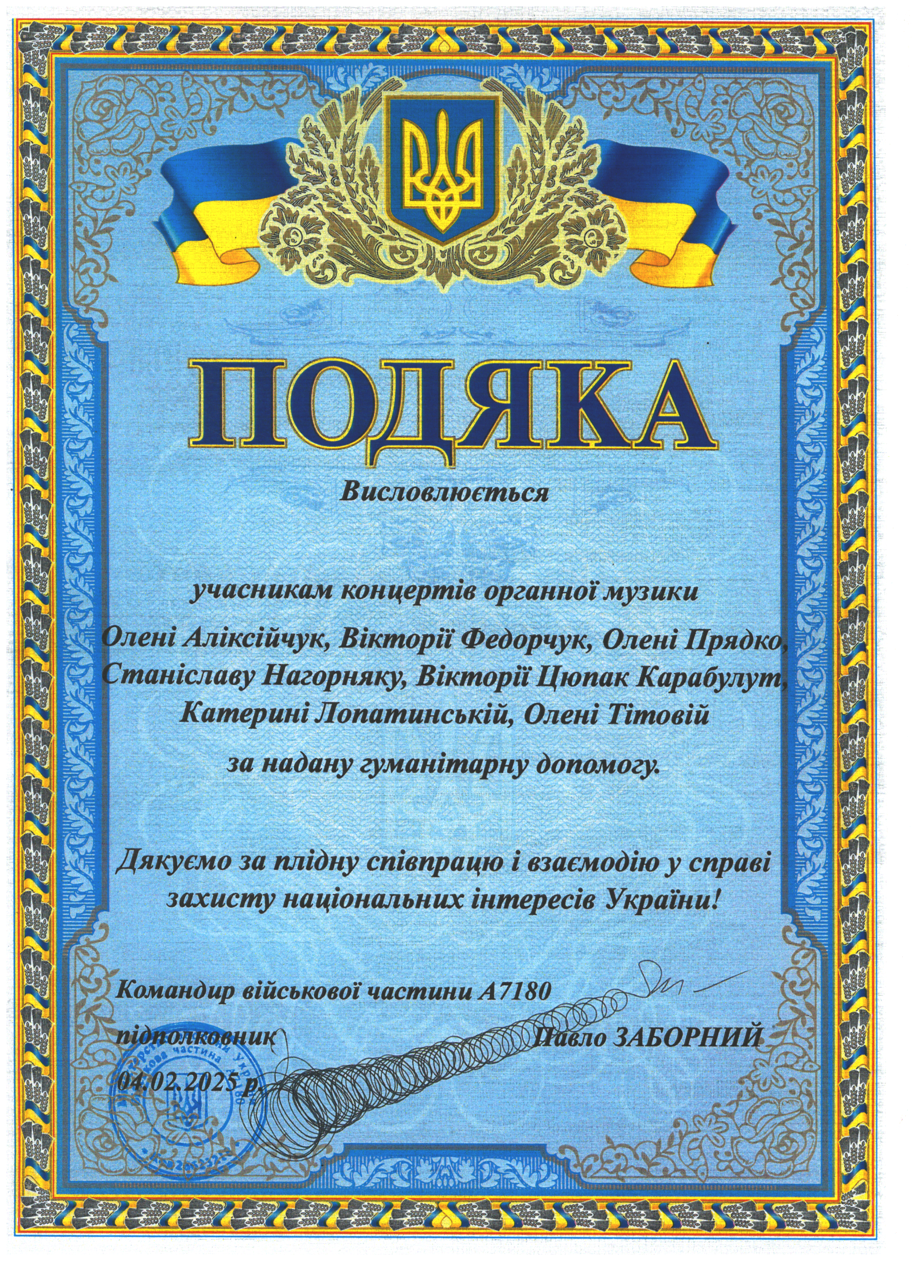 Доцент кафедри музичного мистецтва Аліксійчук О.С. за сприяння громадської організації «PRZYACIOL PODOLA (Друзі Поділля)» (Польща) надавала благодійну і гуманітарну допомогу військовим частинам на Донецькому, Харківському, Чернігівському та інших напрямках. За активну громадянську позицію та плідну волонтерську діяльність вона нагороджена 10-ма подяками від командування військових частин.
